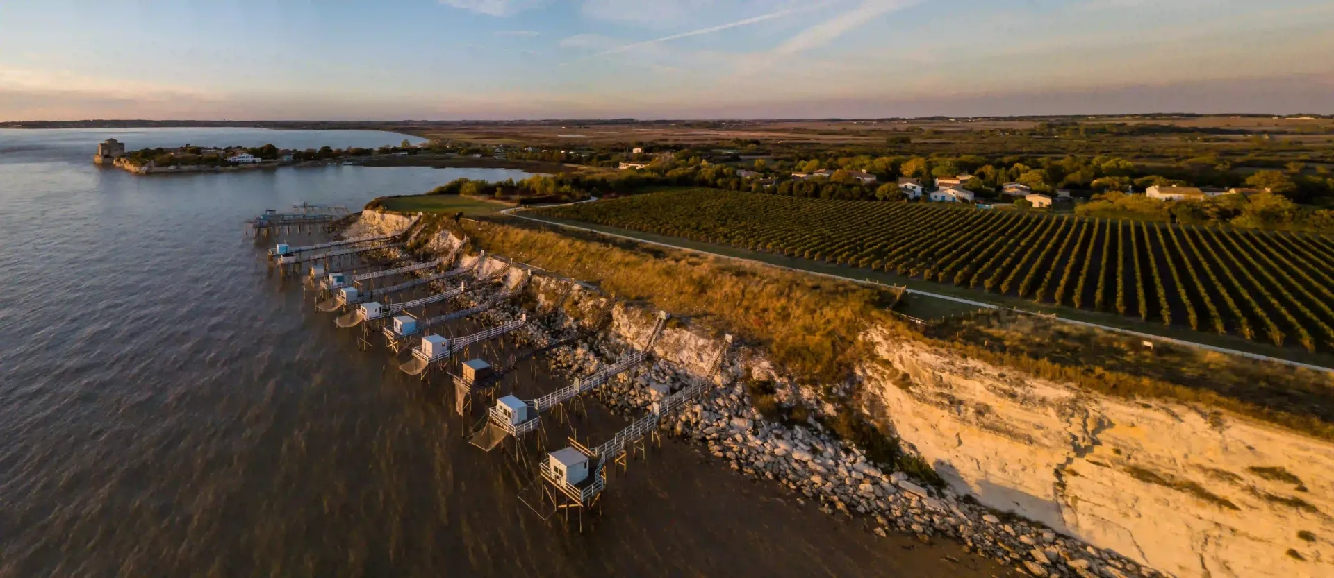 Depuis la Tour Blanche, on profite d'une vue imprenable sur la Roche du Caillaud, ses vignobles et ses carrelets. C'est là où les Américains, en 1917, avaient commencé à construire un immense port en eau profonde afin de recevoir hommes et matériel pour la guerre (plans à voir au Musée). Les falaises furent dynamitées et reculèrent de 30m. L'armistice de 1918 mit fin à l'entreprise. Mais les galeries et les puits de mines ayant été laissés en place, l'énorme vague de 1999 s'est engouffrée dans les ouvertures, fit exploser la falaise et avec elle les 25 carrelets retrouvés entassés au fond de la baie, aux portes des maisons du Caillaud. Aujourd'hui, la plupart d'entre eux ont été reconstruits, courageusement...